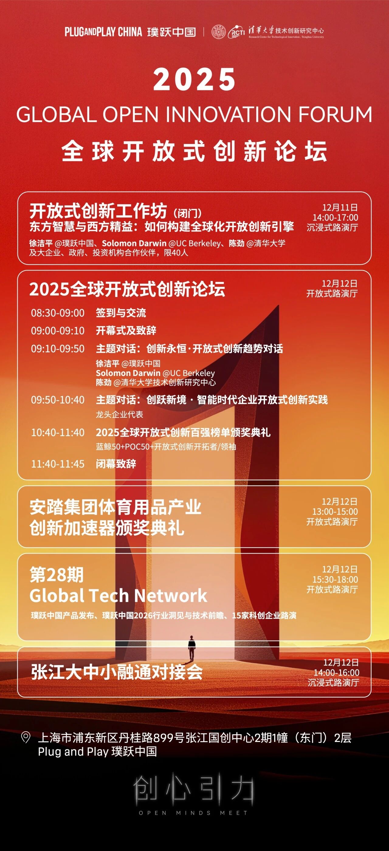 此次GTN年终秀也是2025全球开放式创新论坛的系列活动之一,该论坛是由璞跃中国与清华大学技术创新研究中心共同发起的首个以 “开放式创新” 为主题的年度国际论坛,已经连续举办两届。