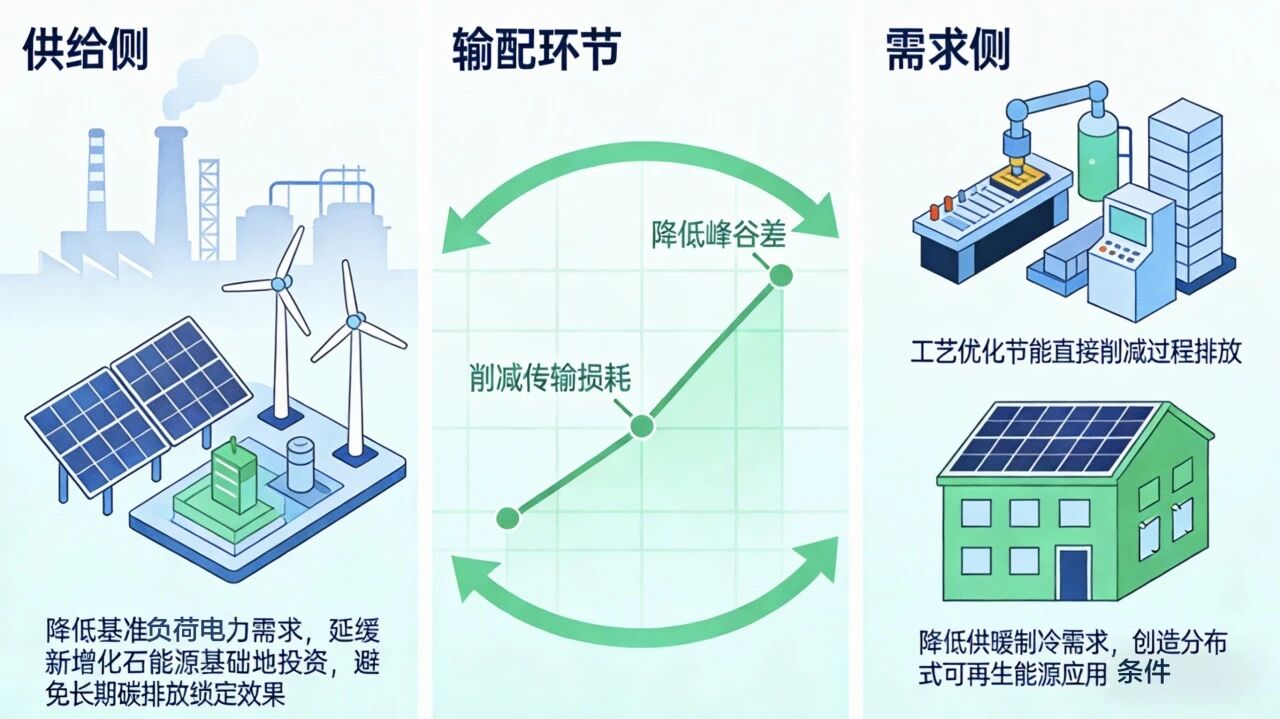 从全生命周期视角看,节能的碳减排效益贯穿能源系统各个环节。在供给侧,节能降低了基准负荷电力需求,延缓了新建化石能源基础设施的投资需求,避免了长期碳排放锁定效应;在输配环节,通过降低峰谷差和总用电量,削减电网传输损耗,从而降低单位电量碳排放强度;在需求侧,工业系统通过工艺优化节能直接削减过程排放,建筑节能则不仅降低供暖制冷需求,还为分布式可再生能源的应用创造了有利条件。