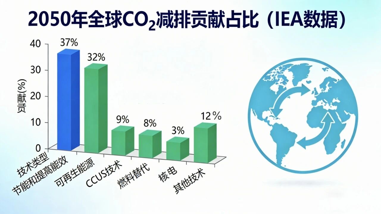 谢克昌院士最早于2022年11月在《什么是实现“碳达峰、碳中和”最直接、最有效、最经济的手段?》专题演讲中明确指出:“相比拓展二氧化碳资源化利用途径,节能提效才是实现碳达峰、碳中和的第一优选。我国单位GDP能耗是世界平均水平的1.4-1.5倍(根据最新2024年数据为1.3倍),若达世界均值,年均可减排34亿吨CO₂,占2020年全国碳排放总量的三分之一。” 国际能源署的分析进一步印证了节能的全局价值:如果全球温室气体排放从目前的330亿吨下降到2050年的100亿吨左右,则2050年前节能和提高能效对全球二氧化碳减排的贡献为37%,发展可再生能源贡献为32%,燃料替代贡献为8%,发展核电贡献为3%,CCUS技术贡献为9%,还有12%贡献由其他技术满足。可见2050年之前,节能和提高能效,被视为全球能源系统二氧化碳减排的最主要途径。