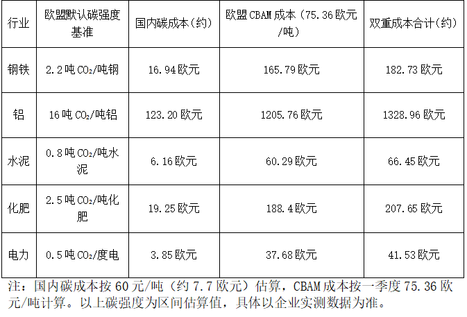 我们算笔实在账:某企业每吨产品排2吨CO₂,国内碳价60元/吨(约7.7欧元),国内成本120元(约15.4欧元);欧盟CBAM按75.36欧元/吨计算,需额外支付150.72欧元,合计碳成本高达166欧元,足以抹掉高耗能企业全部毛利。