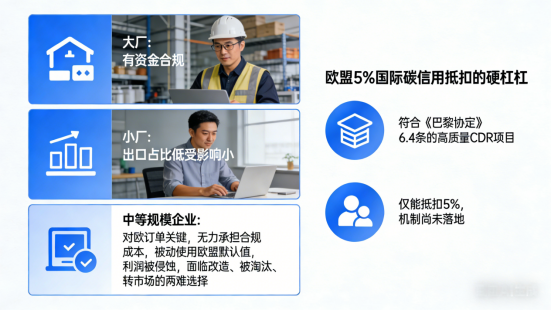 面对CBAM,不同规模企业处境悬殊:大厂有资金合规,小厂出口占比低受影响小,最危险的是中等规模企业。这类企业对欧订单关键,却无力承担几十万的合规成本,只能被动使用欧盟默认值(比实测值高20%-50%),利润被持续侵蚀,还面临“改造、被淘汰、转市场”的两难选择。